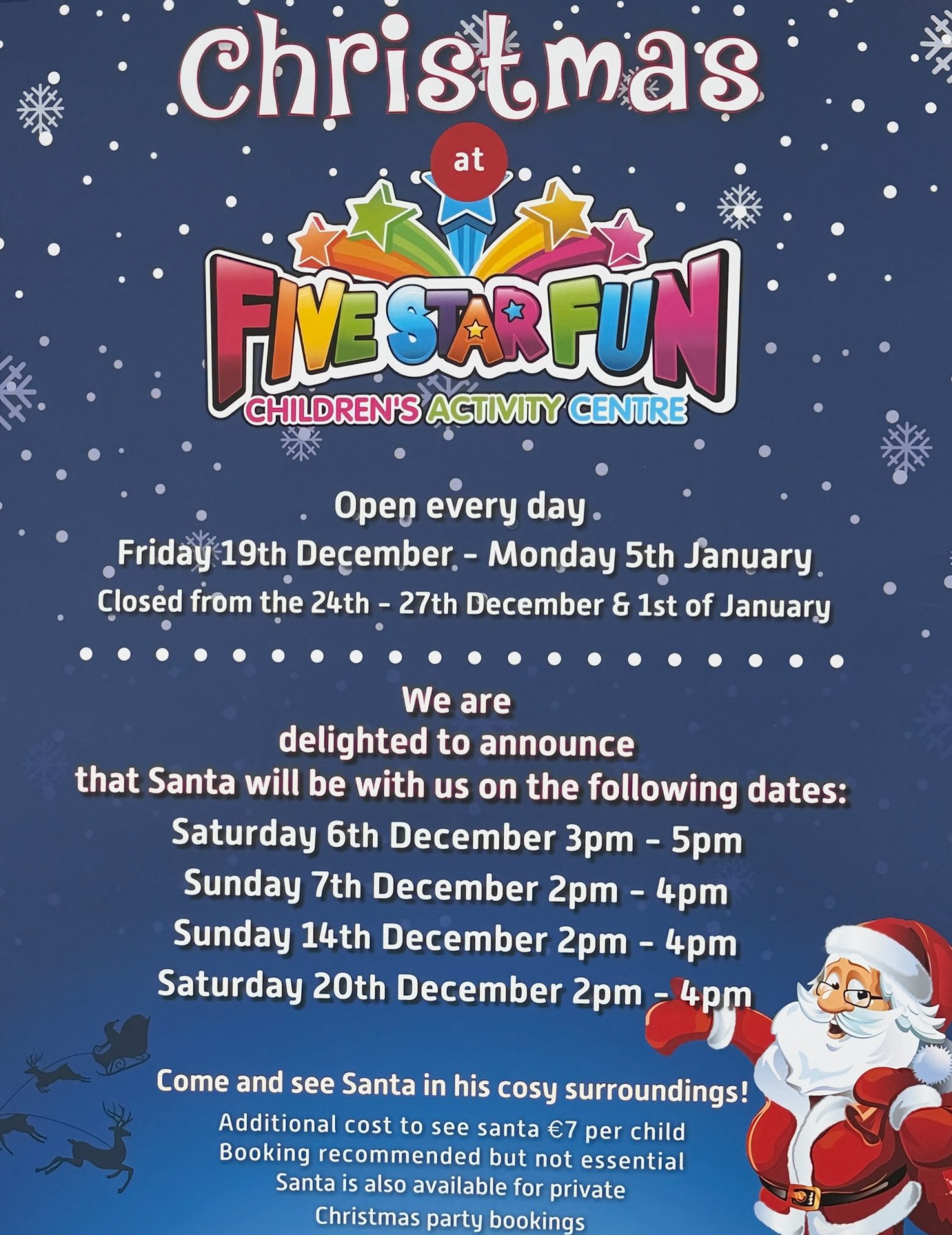 OPEN FROM 930AM EVERYDAY DURING CHRISTMAS SCHOOL HOLIDAYS EXCEPT FOR CHRISTMAS EVE, CHRISTMAS DAY, ST STEPHENS DAY, 27TH DECEMBER AND NEW YEARS DAY